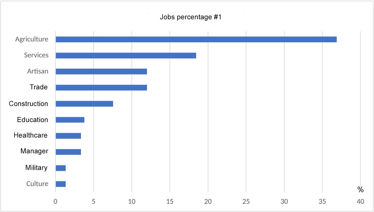 The first (percentage of professions #1) includes only the professions indicated in the acts, almost all of them are for men (we very rarely find the profession of a deceased woman with indicated farmer, winemaker, seamstress).